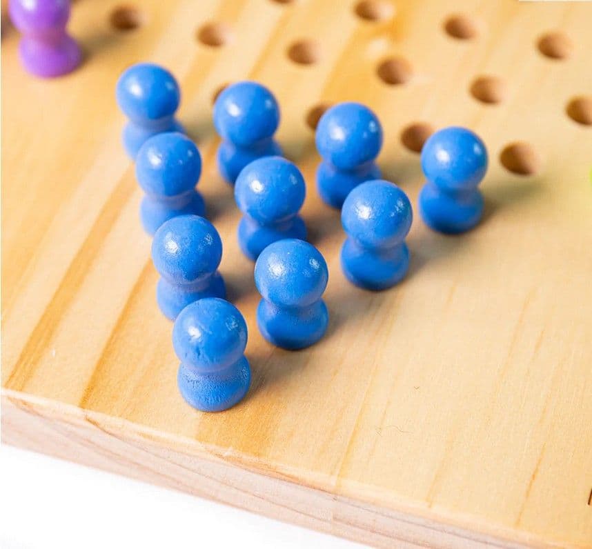 How to play chinese checkers: The aim of this wooden board game is to get your pegs to the star point opposite yours. The first player to do this is crowned the winner. Each player takes it in turns to move their peg forward by moving into one of the adjacent holes or jumping over into a hole two pegs ahead.