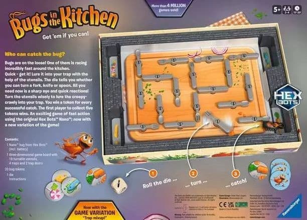 There's a pesky little bug in the kitchen! And it's not just any bug - it's a HEXBUG nano, scuttling around the game board! Quick - can you catch it in the trap? By turning knives, forks and spoons you can direct the bug into the trap. Throw the die to discover which utensils you can turn. Catch the bug in the trap and earn a token - the first player to collect 5 tokens wins the game. A fun-to-play family game suitable for 2-4 players, aged 6 years upwards.