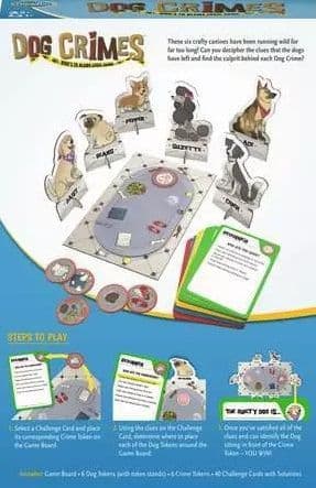 These six crafty canines have been running wild for far too long! Can you decipher the clues that the dogs have left behind and find the culprit behind each dog crime? Your Goal: Use the clues given to determine the identity of the guilty dog. Includes 1x Game Board, 6x Dog Tokens, 6x Crime Tokens, 40x Challenge Cards. This game is suitable for 1 player. Suitable for ages 8 years and up.