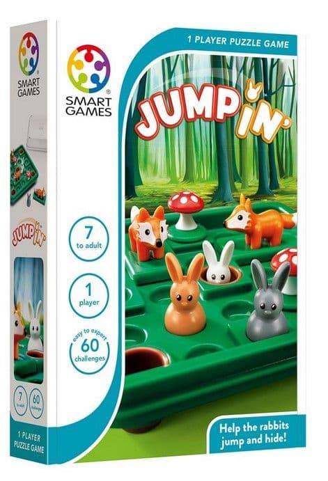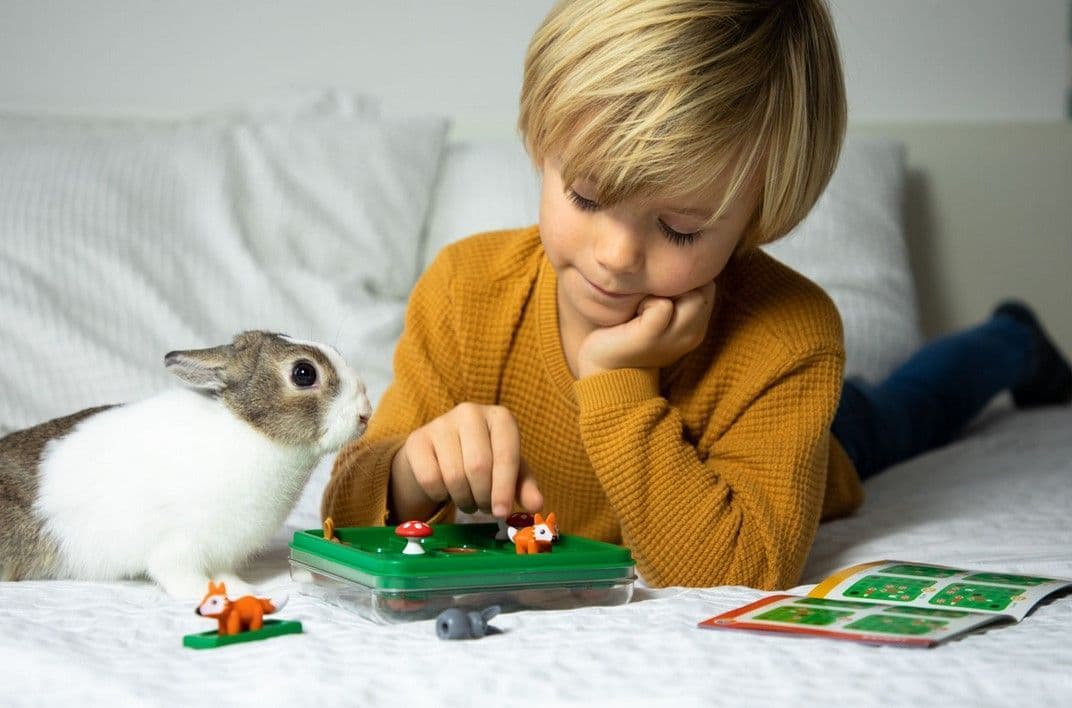 Portable game board with lid - perfect for travel, 3 rabbits, 3 mushrooms, 2 foxes, booklet with 60 challenges and solutions supplied