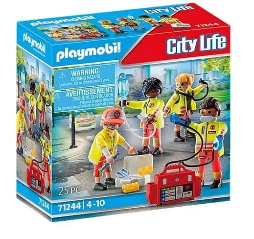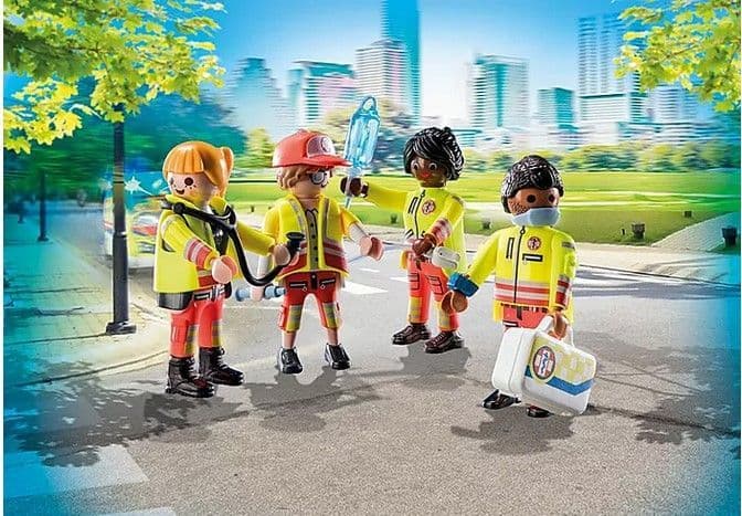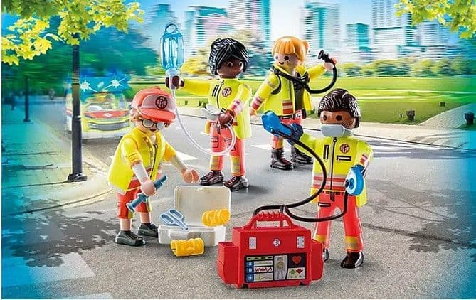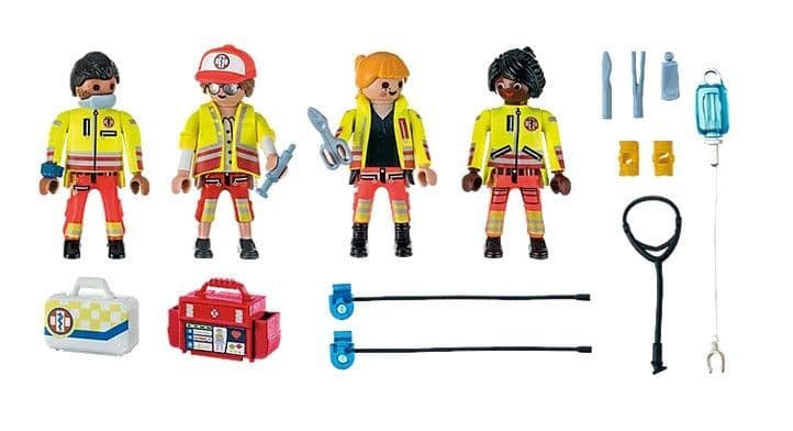 Figures: 2 men, 2 women; accessories: 1 infusion with infusion tube, 1 stethoscope, 1 first aid instruments, 2 bandage splints, 1 water bottle, 1 defibrillator, 1 first aid kit, 1 cap, 1 wristwatch