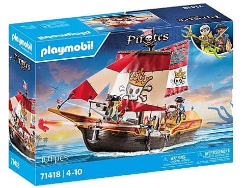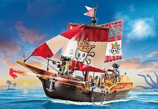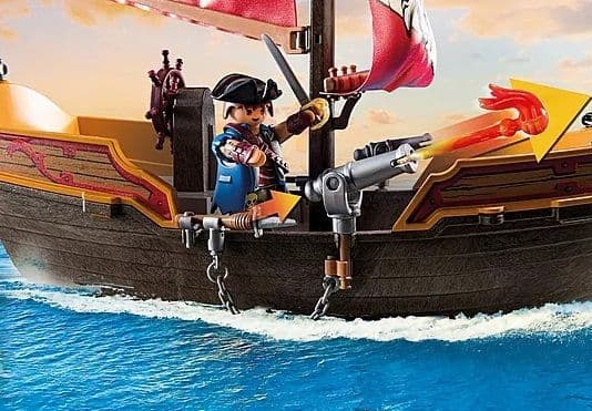 - 3 armed pirates, monkey, rat and parrot, swimming boat with anchor, cannons and 3 sails, opening in the base for playing the interior