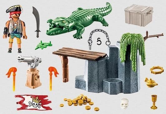 Figures: 1 pirate; Animals: 1 alligator; Accessories: 1 rock with footbridge, chain and plant, 1 cannon, 2 projectiles, 1 flag, 1 chest with coins, 1 golden cup, 1 golden jug, 1 crown, 1 pirate hat, 1 skull, 1 sabre