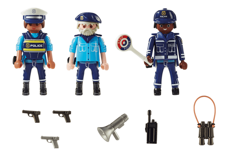 Figures: 2 policemen, 1 policewoman; Accessories: 2 police caps, 1 police peaked cap, 1 megaphone, 2 binoculars, 3 pistols, 3 pistol holsters, 1 police ladle, 1 radio set